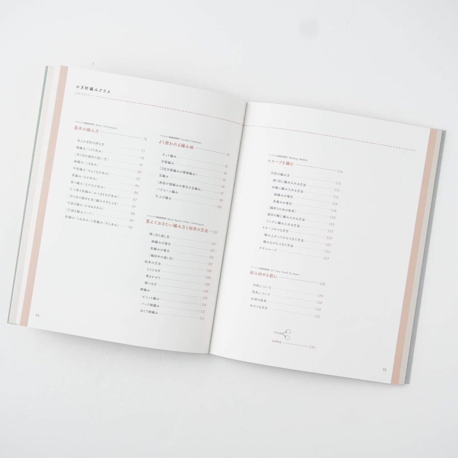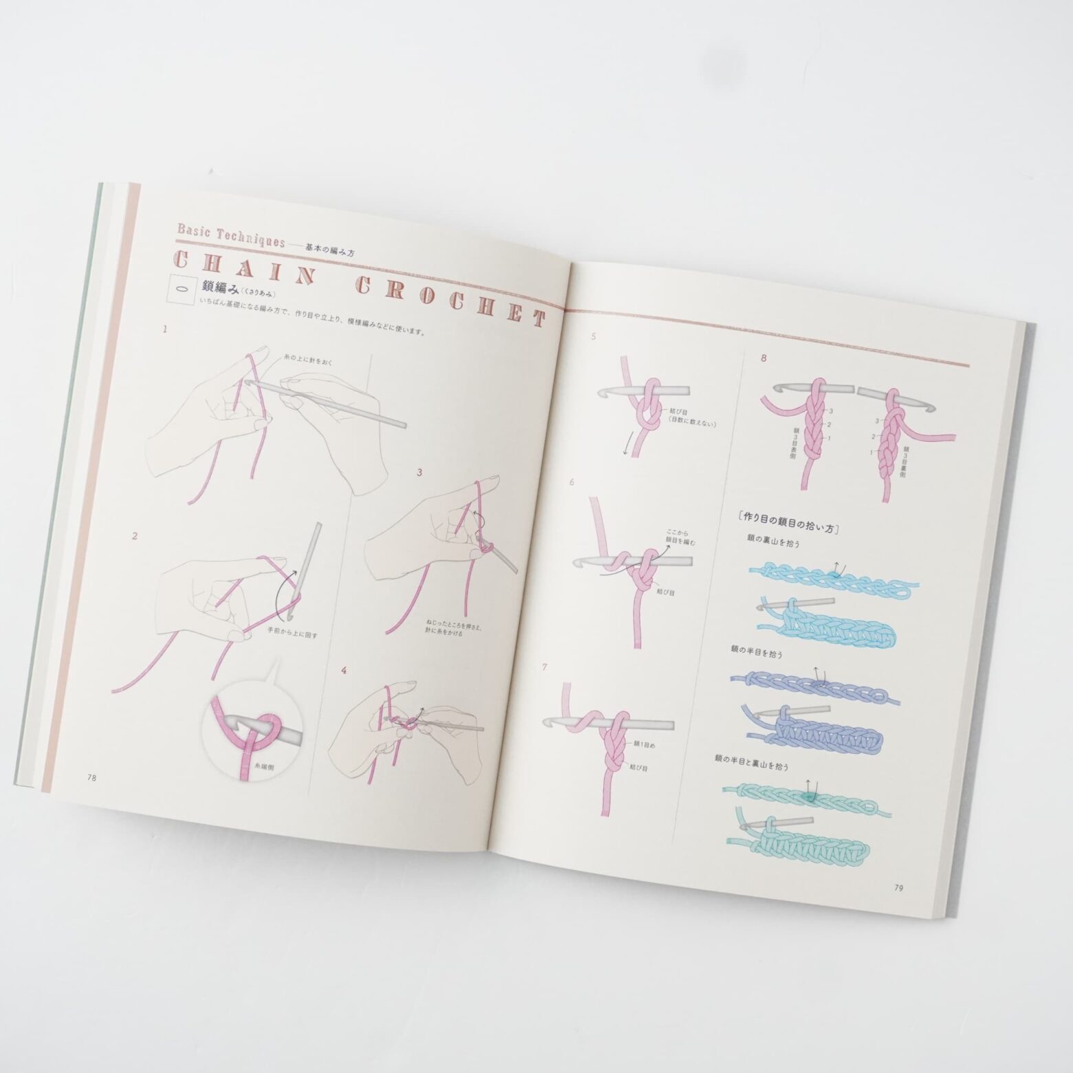 写真では見えにくい編み目を大きなイラストで表現し、どこに針を入れて編むのか、どう引抜くのかをわかりやすく解説しています。