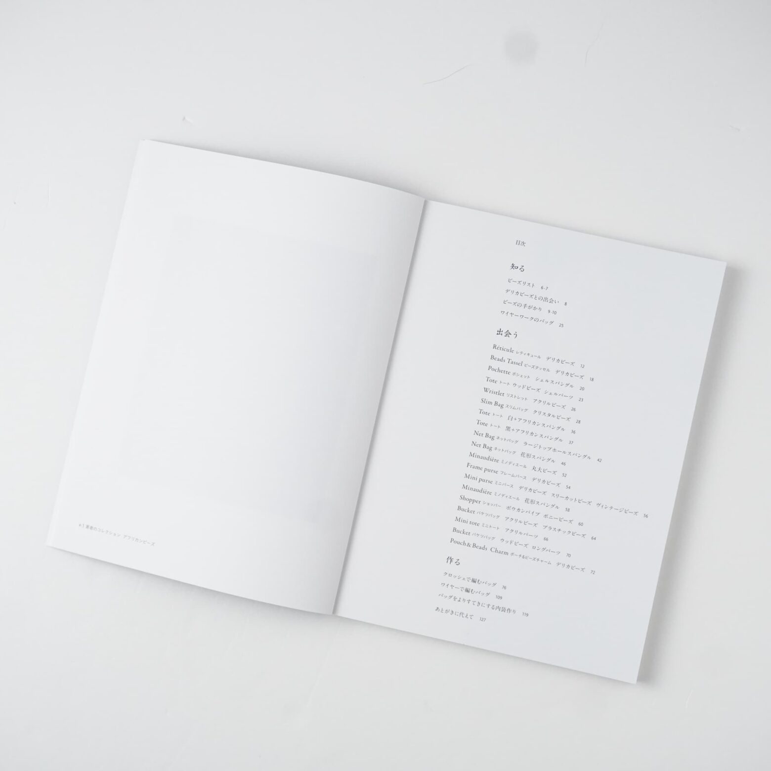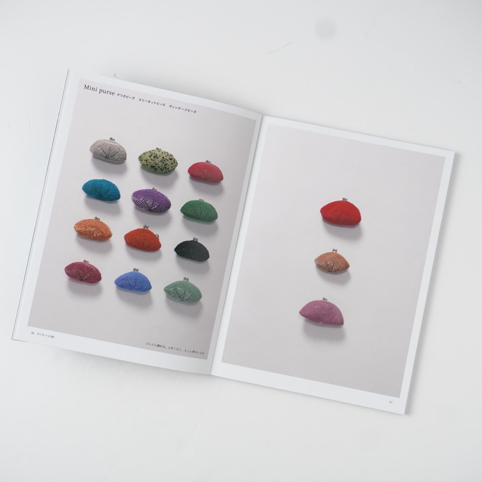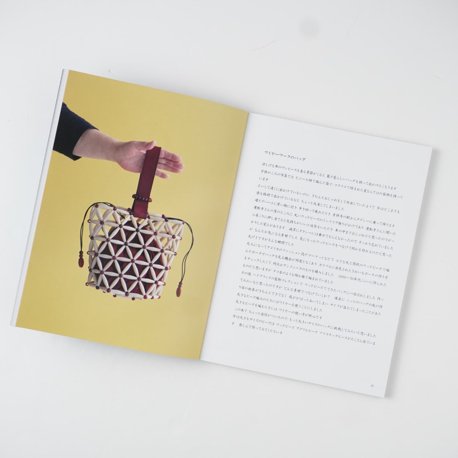 5)ワイヤーワークの技法はアクセサリー作りに用いられることが多いのですが、下田さんはこの技法を応用され、いままでにない新しい感覚のビーズバッグを誕生させました—たくさんの書籍を作ってこられた下田さんですが、ワイヤーで編むバッグの紹介はこの本がはじめてになります。