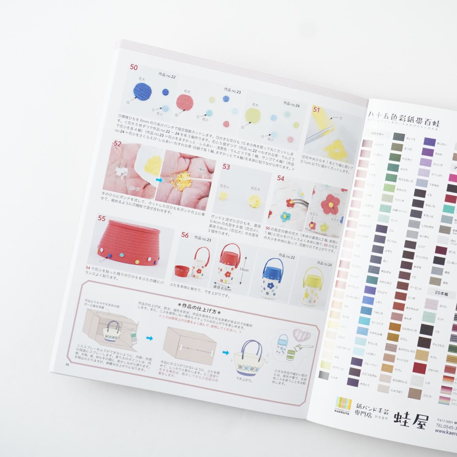 必要な道具の説明から、きれいに仕上げるためのテクニックまで、豊富な写真とともにわかりやすく解説。これから紙バンド手芸を始めたい方にも最適です。総作品点数:約20点(色違いを含む)オールカラー。