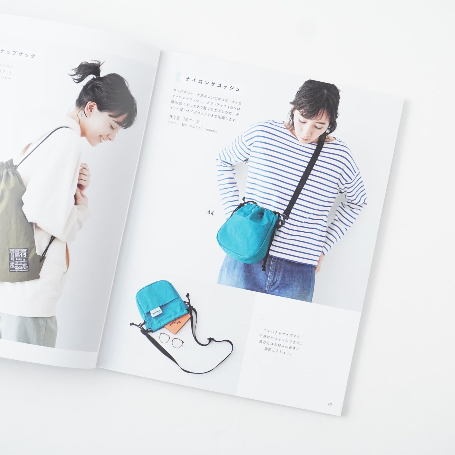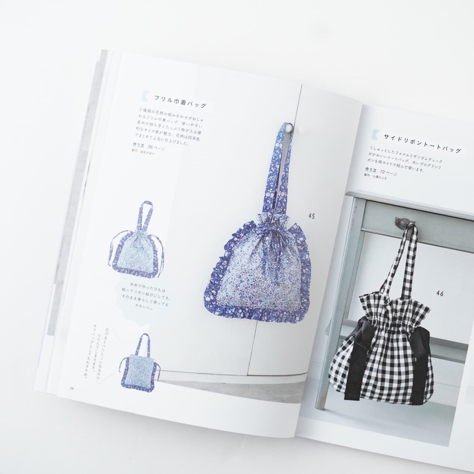 1枚でまっすぐ縫って作るシンプルなものから、裏布つき、マチつき、形のアレンジ、バッグのバリエーションなど、使いやすくておしゃれなデザインを掲載しています。