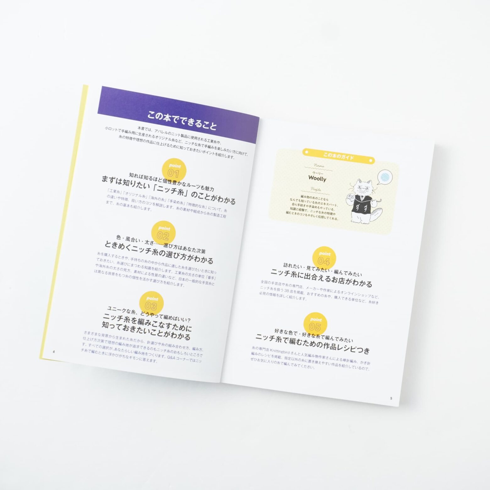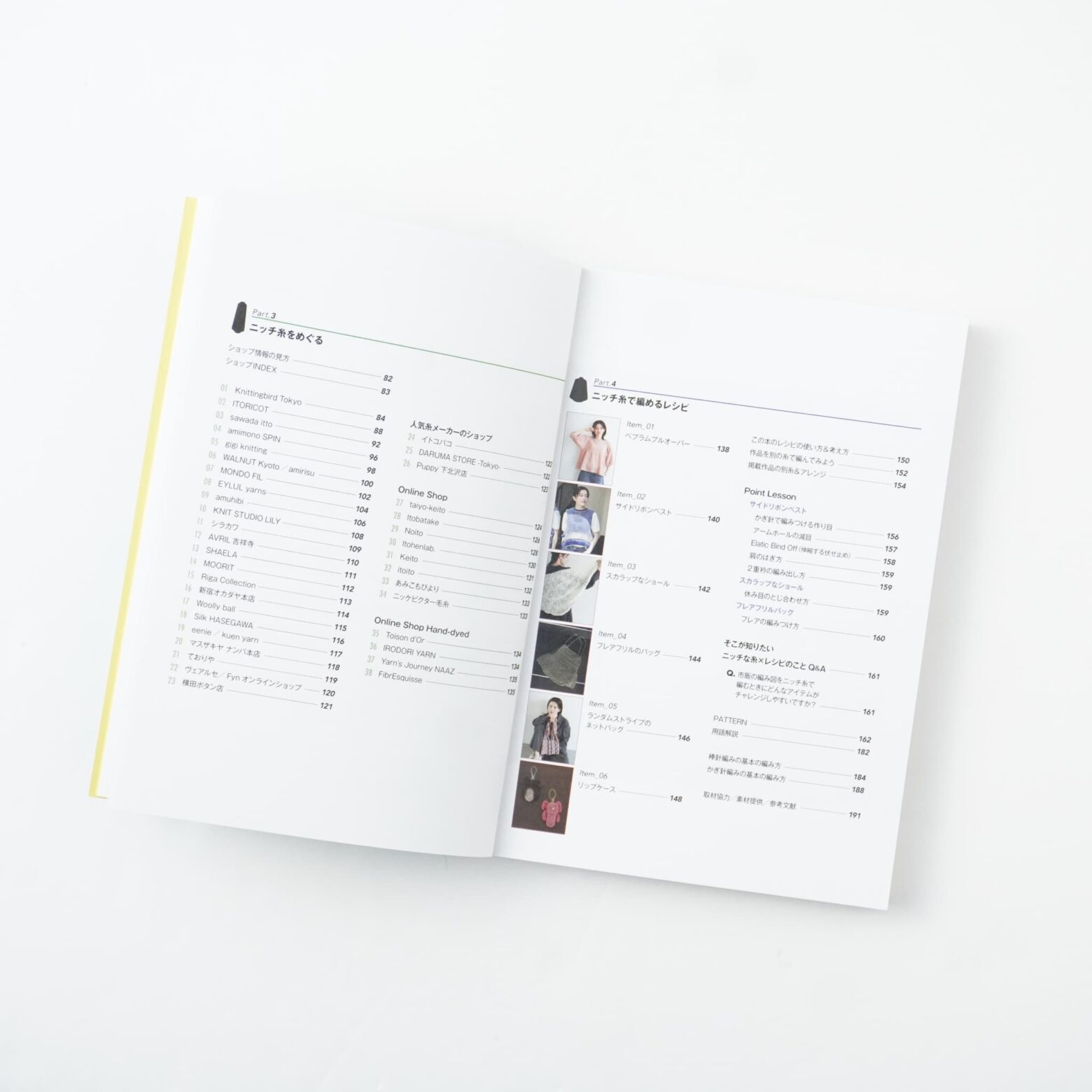 糸を調べて・買って・活用するための技法解説に加え、ニッチ糸で編めるレシピや、日本国内のニッチ糸を扱う糸専門店の情報を掲載しました。