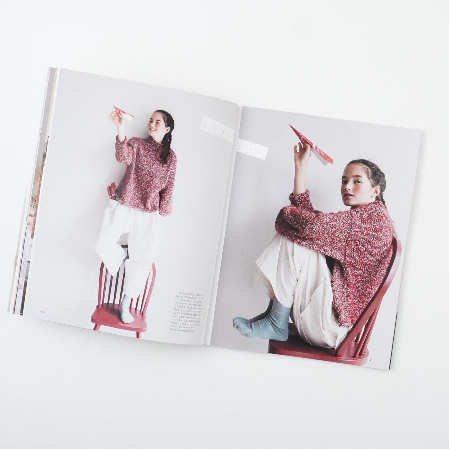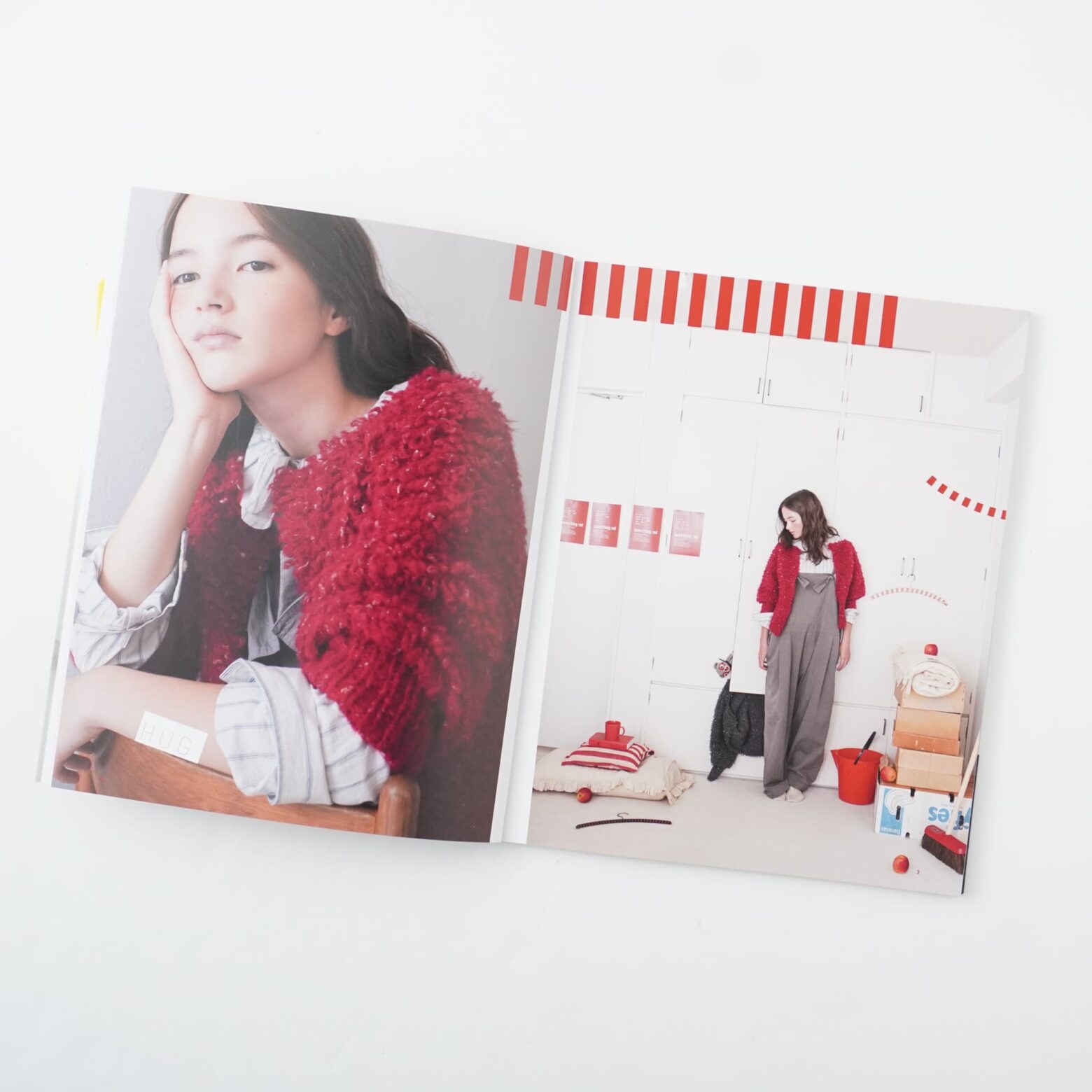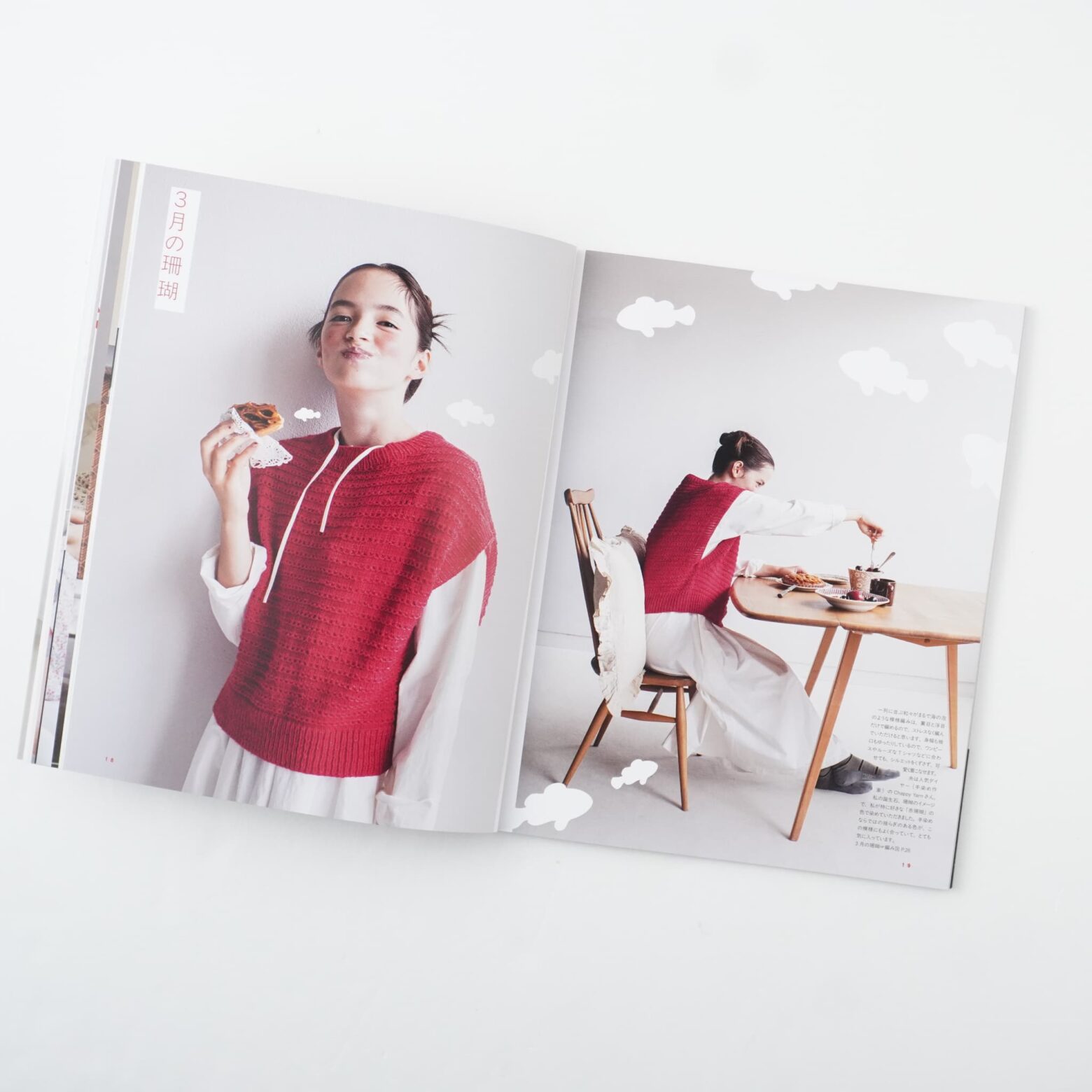 amuhibiが信頼する糸メーカーから赤い毛糸を選んで作った本誌は、かぎ針のウェア3点を含む、著者デザイン7点のほか、風工房、西村知子、くげなつみの、3名の人気ニットデザイナーの作品が3点の、計10点が掲載されています。