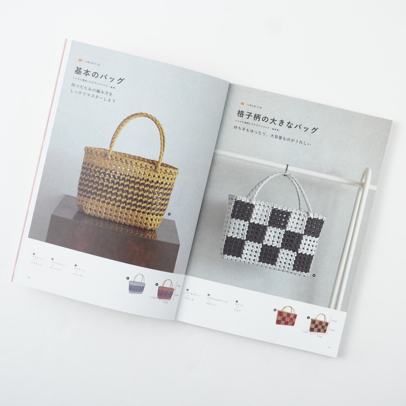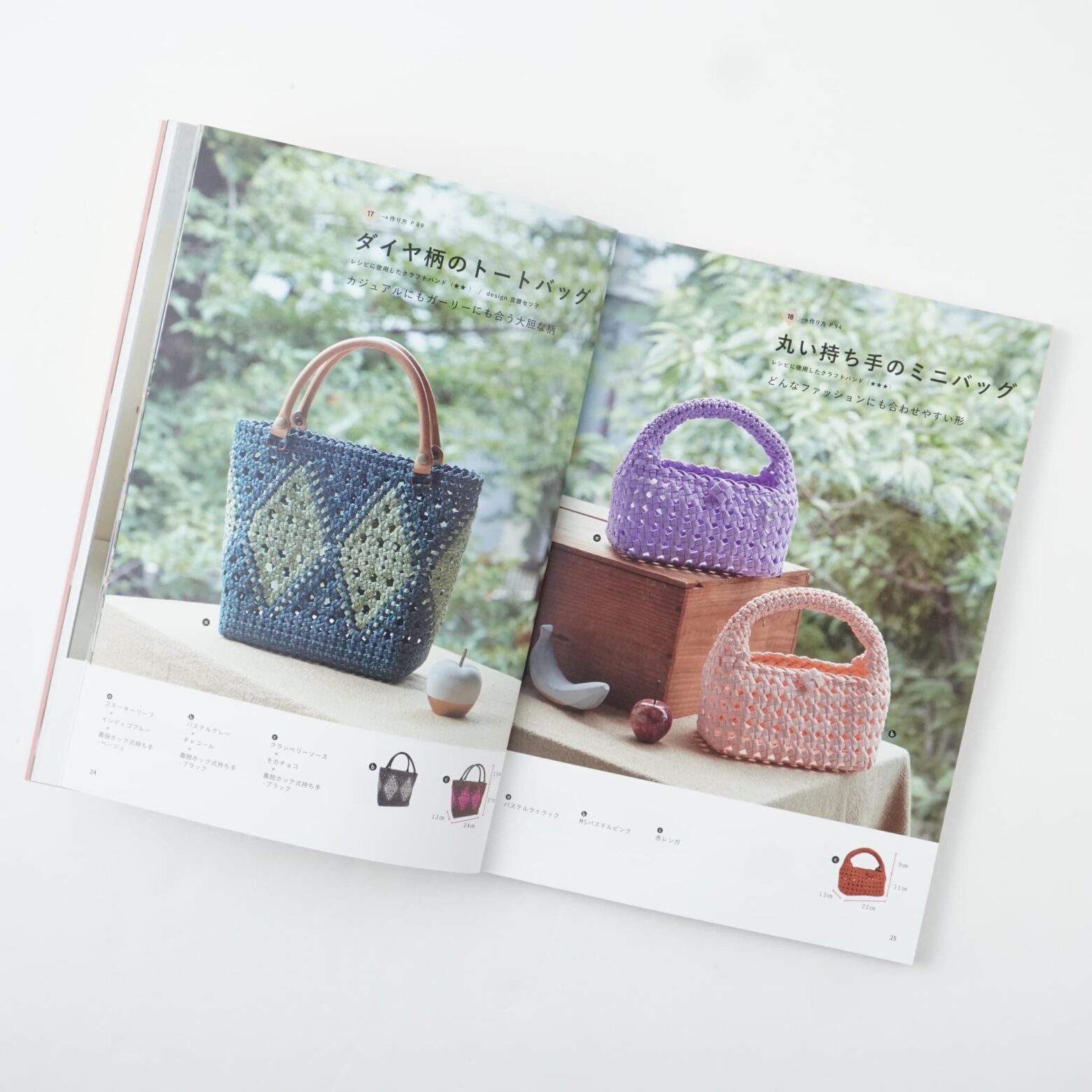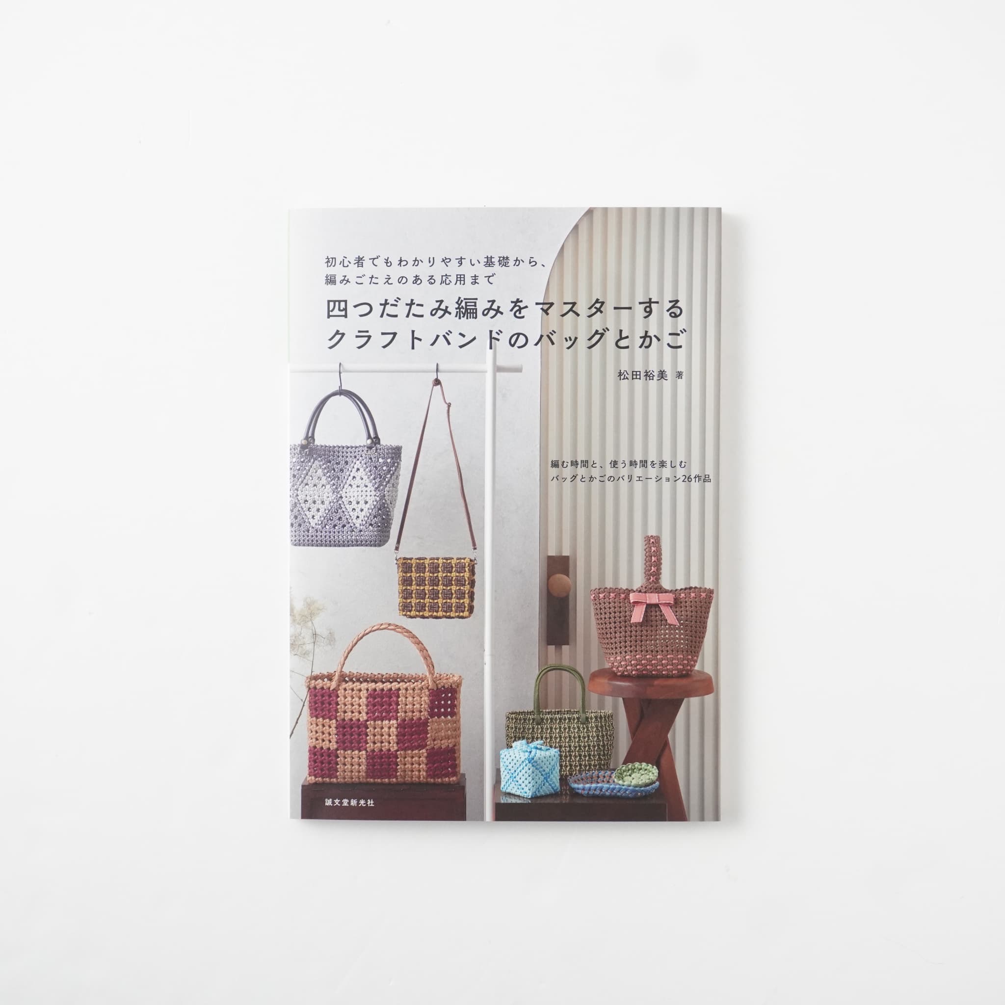 本書では、人気の「四つだたみ編み」を用いて、バッグやかごなど26点を掲載。