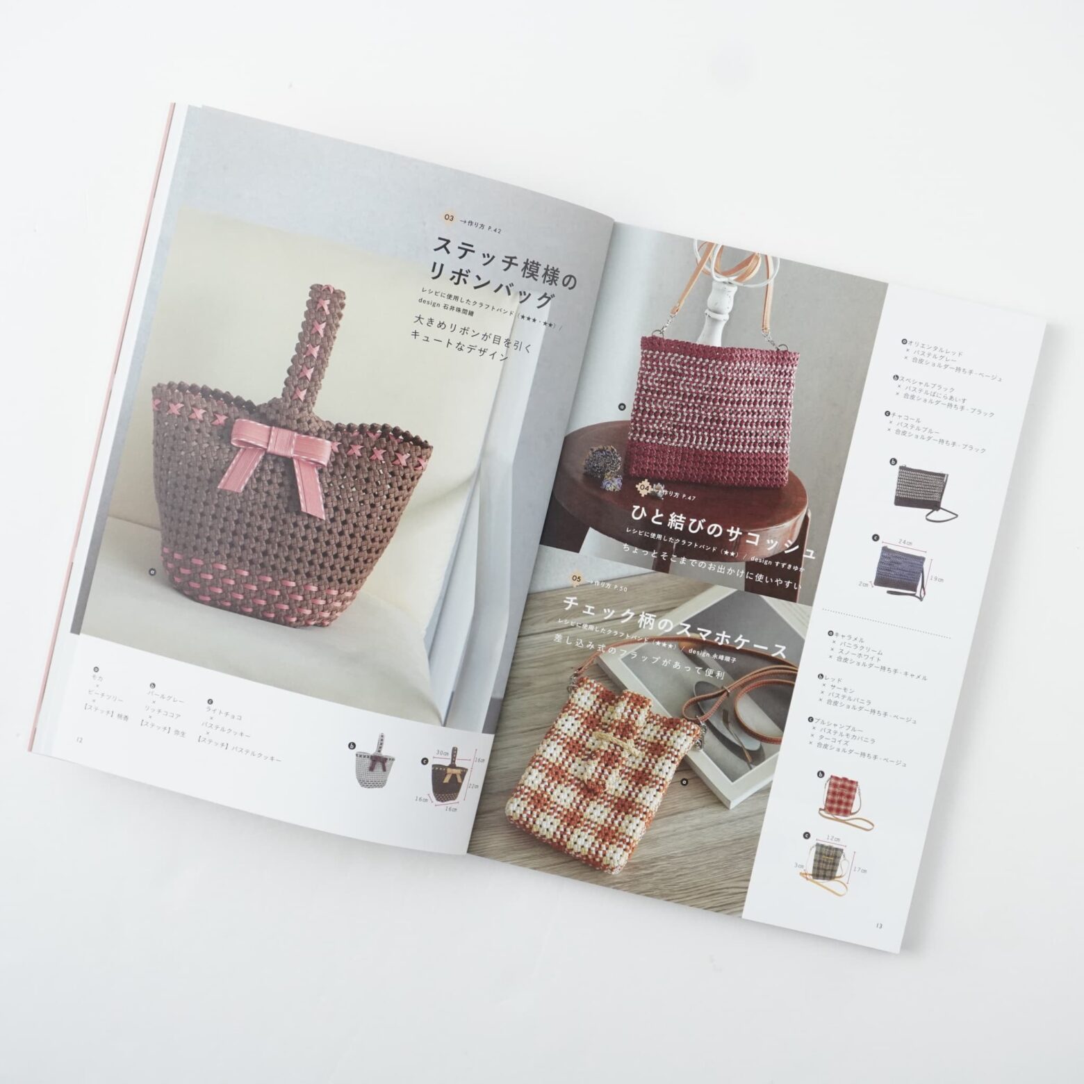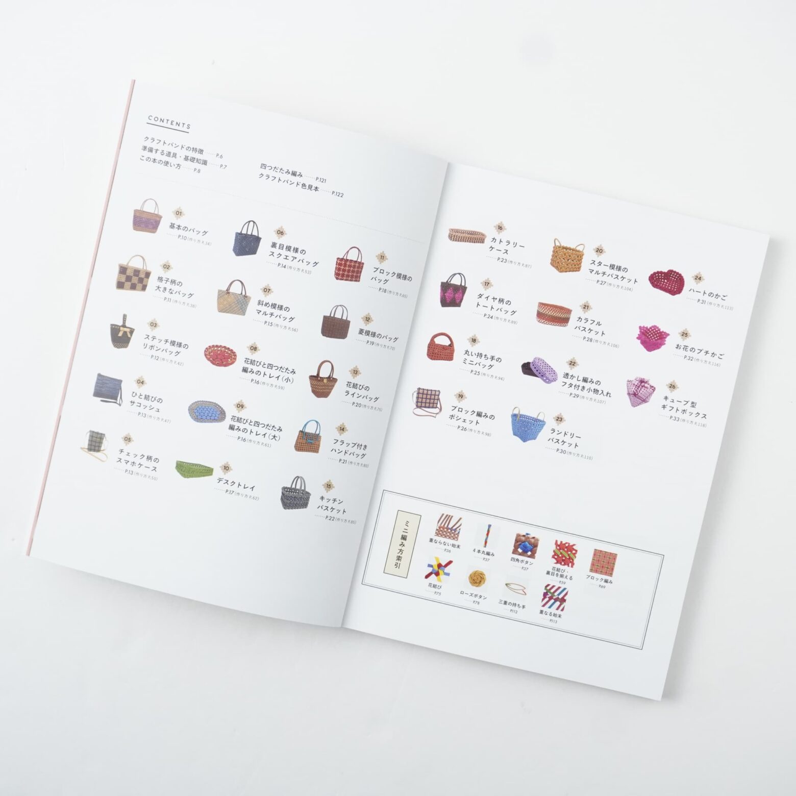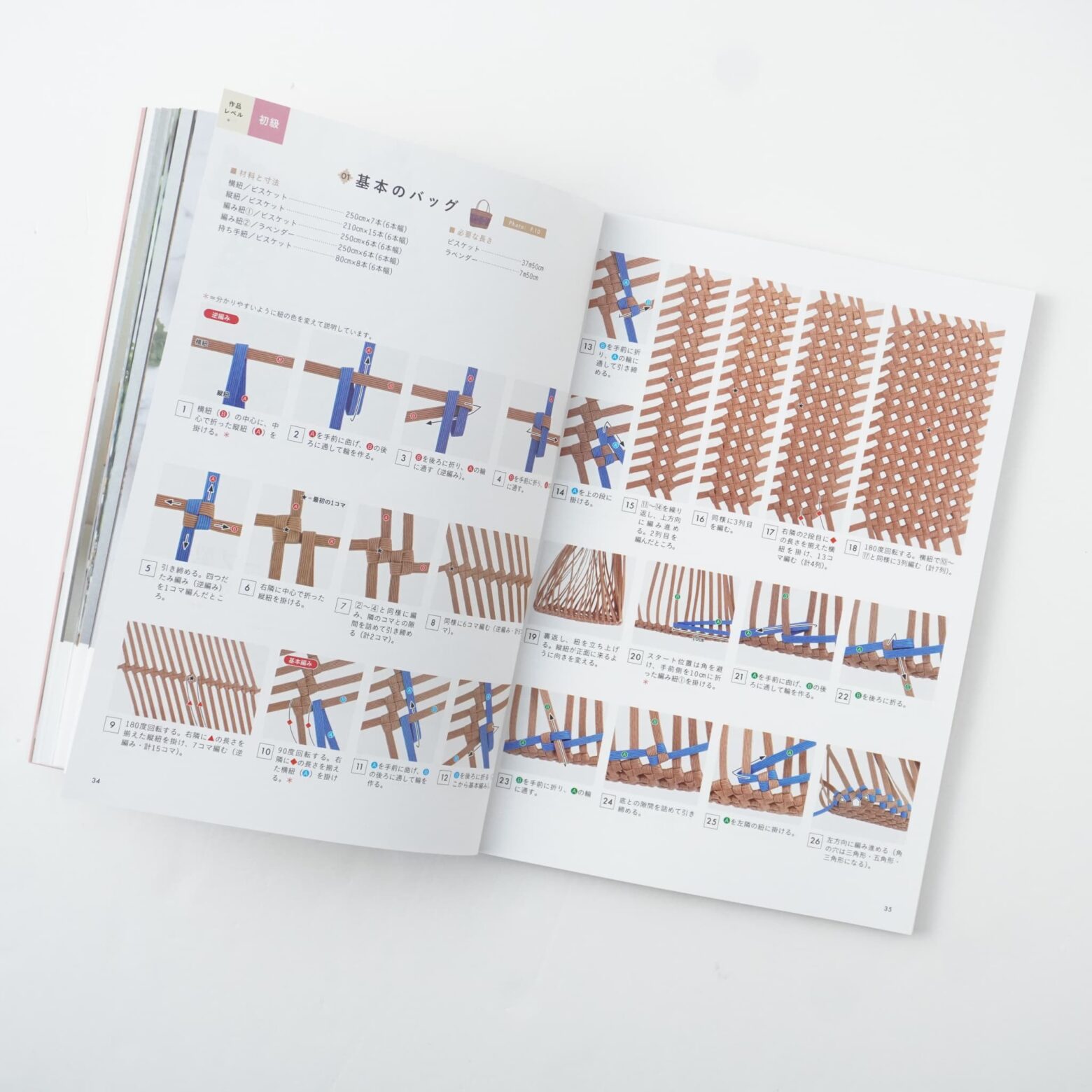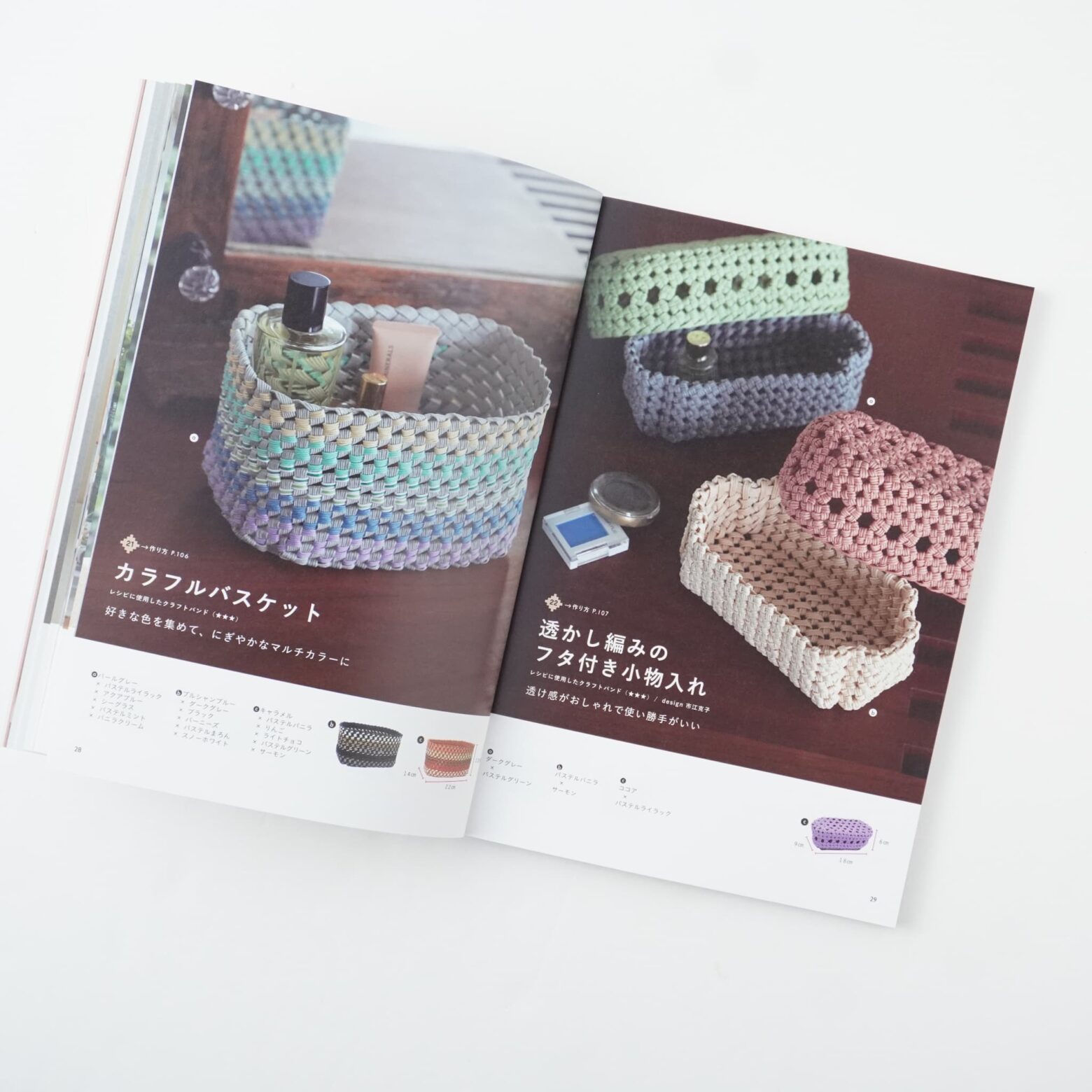 本書では、人気の「四つだたみ編み」を用いて、バッグやかごなど26点を掲載。