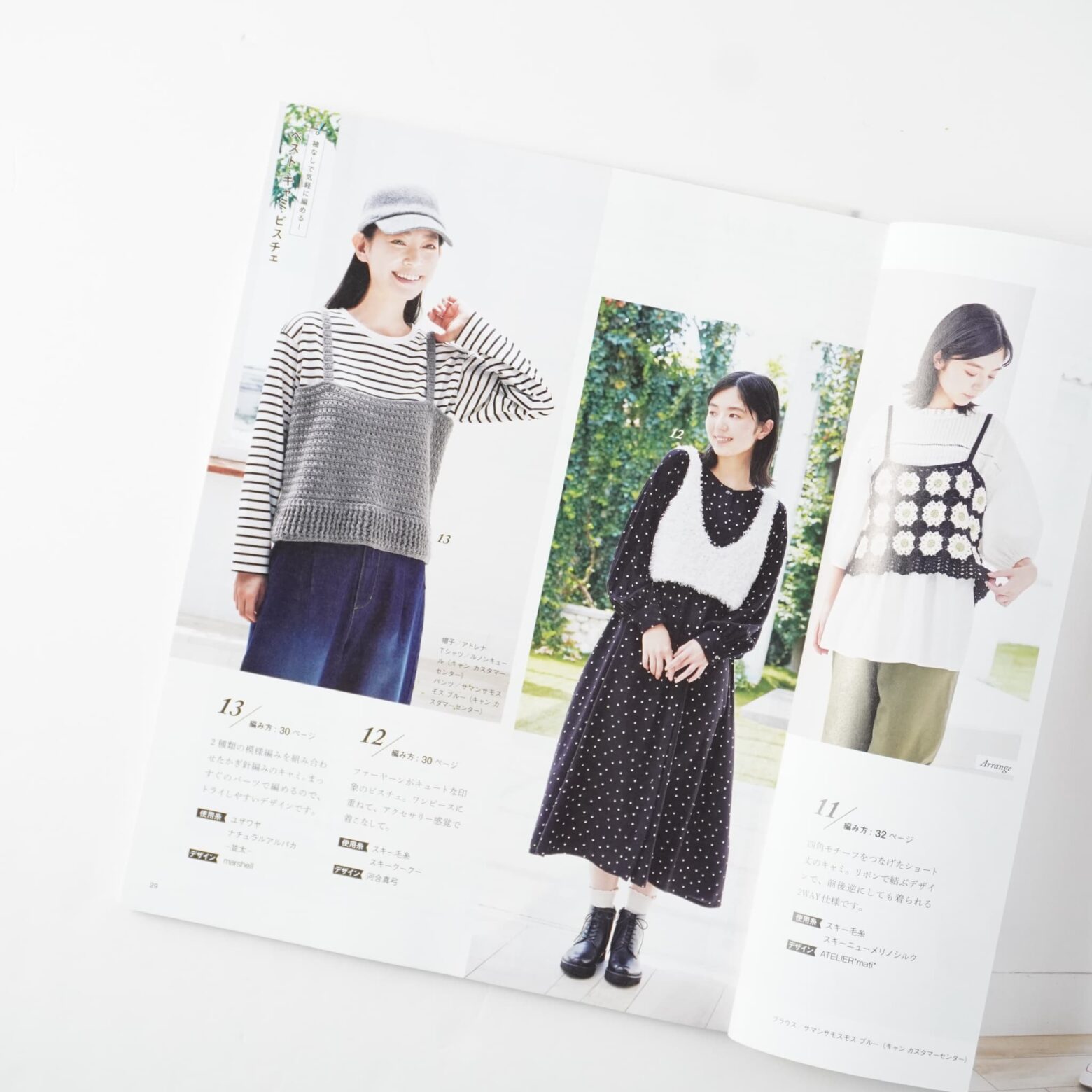 気軽に編めてトレンド感もある秋冬の手編みニット作品集。ベスト、キャミ、ビスチェ、プルオーバー、カーディガンに加え、帽子やマフラーなどのこものも充実しています。