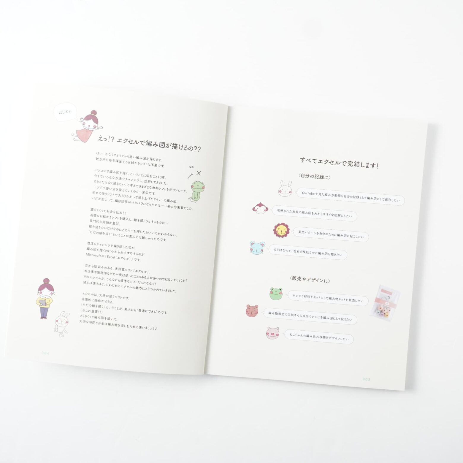 この本は、エクセルで編み図をつくる方法を教えてくれる本です。編み図を自分で描きたい人、たとえば編み物作品を作ってキット(材料+編み図)にして販売したい人はもちろん、編み物講師、編み物作家などもワークショップやお客さま対応などで編み図を起こすこともあり、このような編み物を仕事としている人にとっても、お客さまとの接点は増え、収入を得る機会が得られるアイテムとなります。