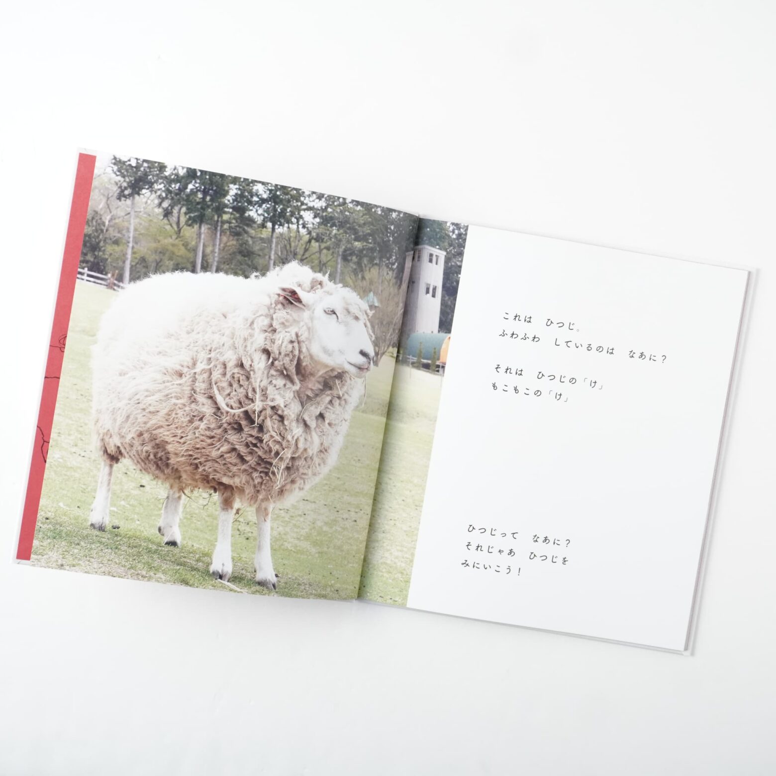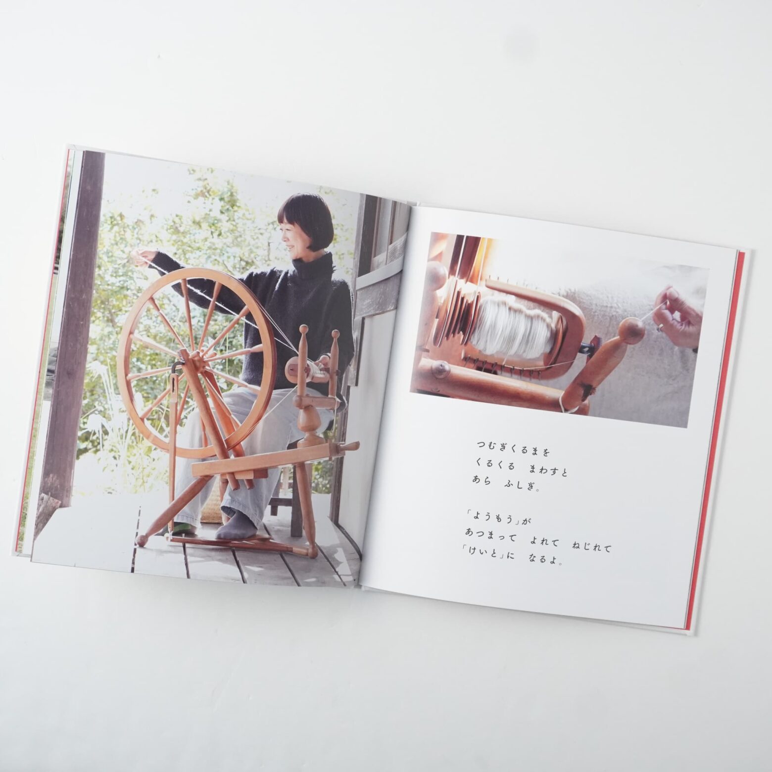 牧場にいるたくさん羊、毛刈りの風景、糸を紡ぎ、染める工程をオール写真でリアルに見せます。