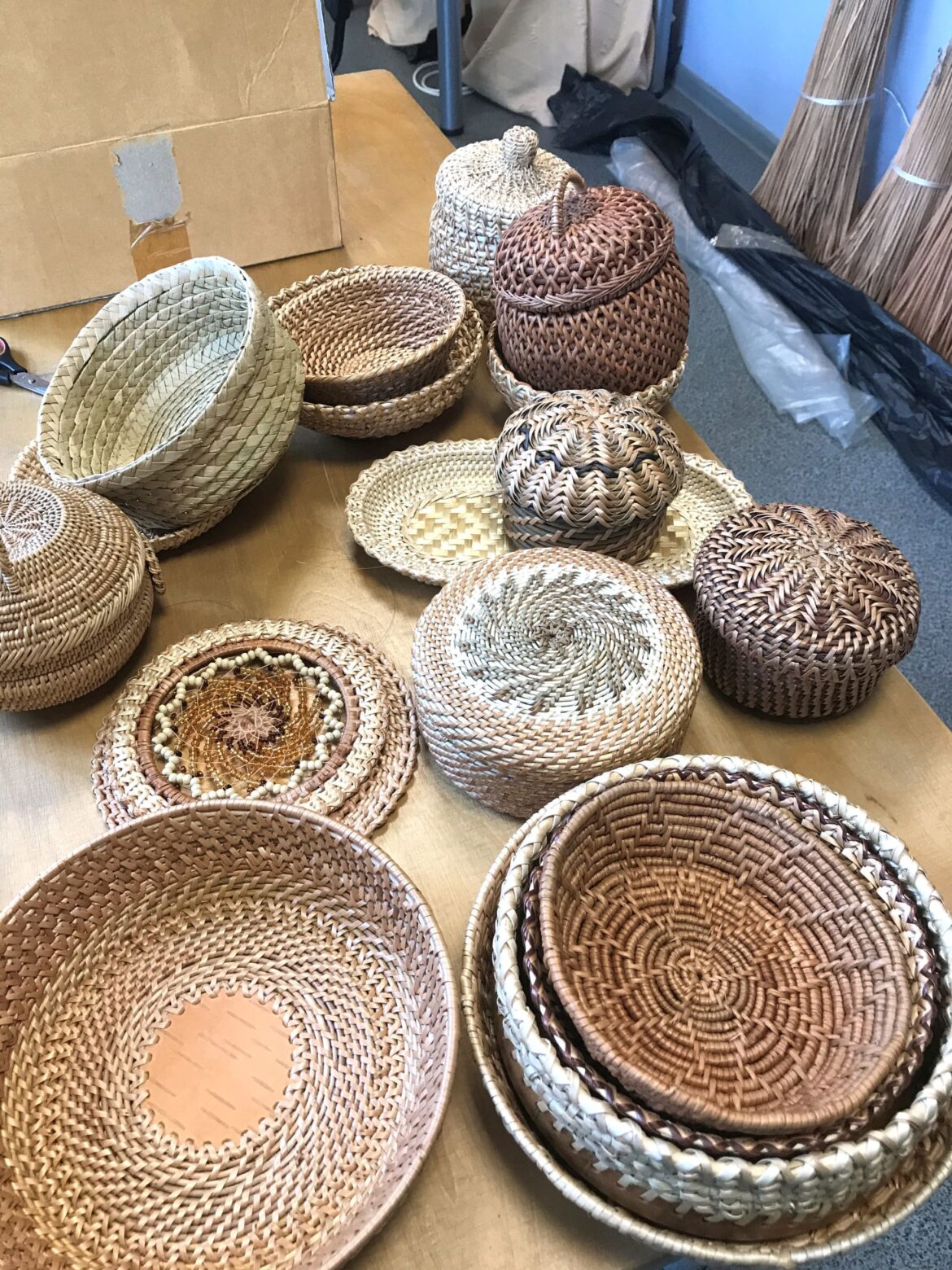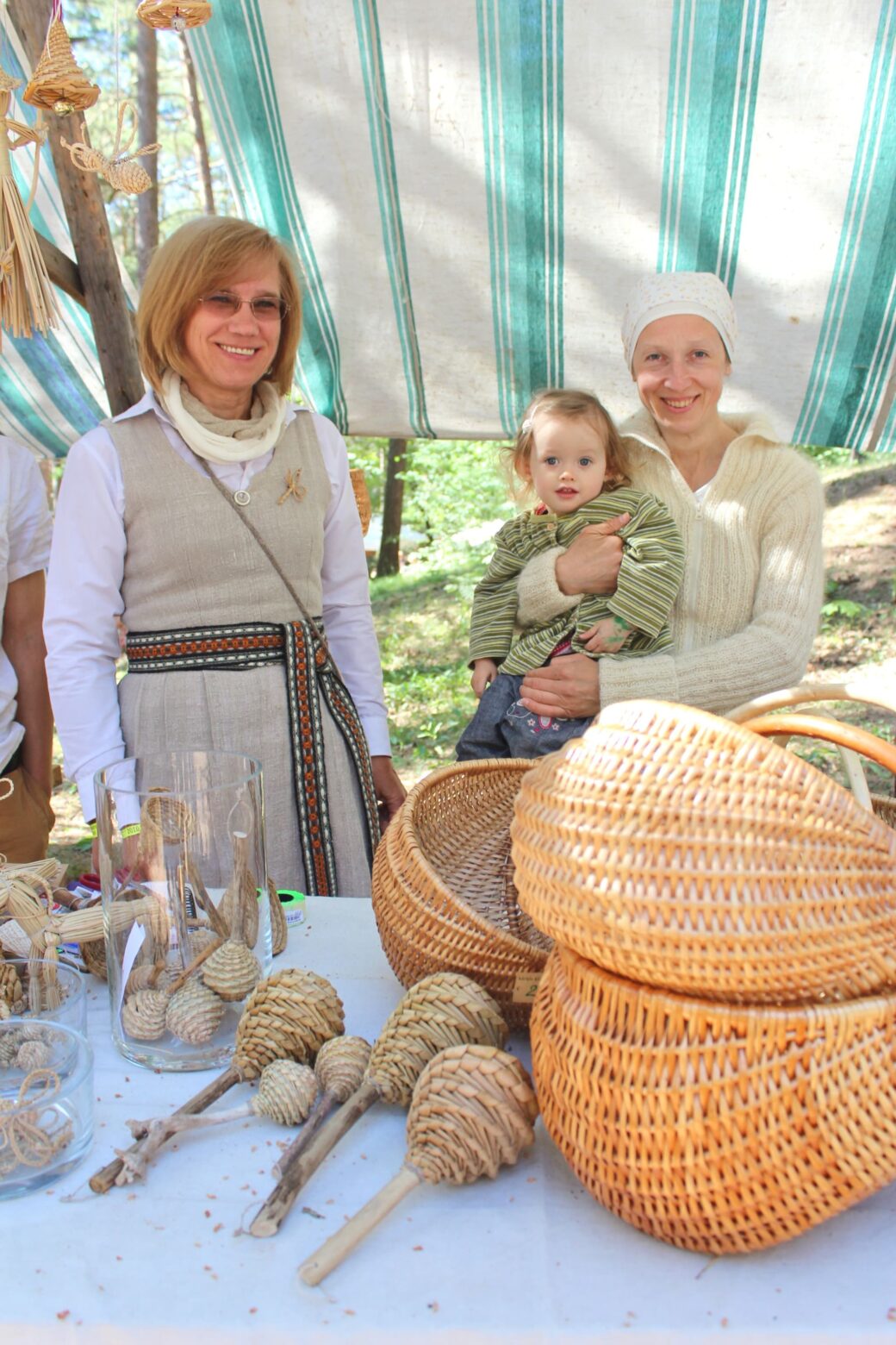現在62歳になるイネタ先生が二十歳だった頃、お店できれいな編み製品やバスケットを買うのは難しく、市場では高値で取り引きされていたそうです。どうしても自宅用に欲しかったイネタ先生は、ある日新聞で編み細工のクラスの広告を見つけ、受講をスタート。手始めに、柳の細枝とトウヒの根を使ったバスケット編みを教わったそうです。その後、バスケット編みを専門とする「TLMS “Tīne”」のメンバーになり、手のあいた時間にバスケットや小物入れを編むようになりました。