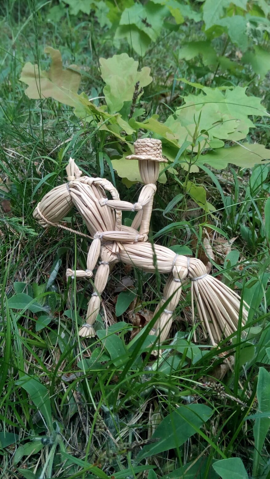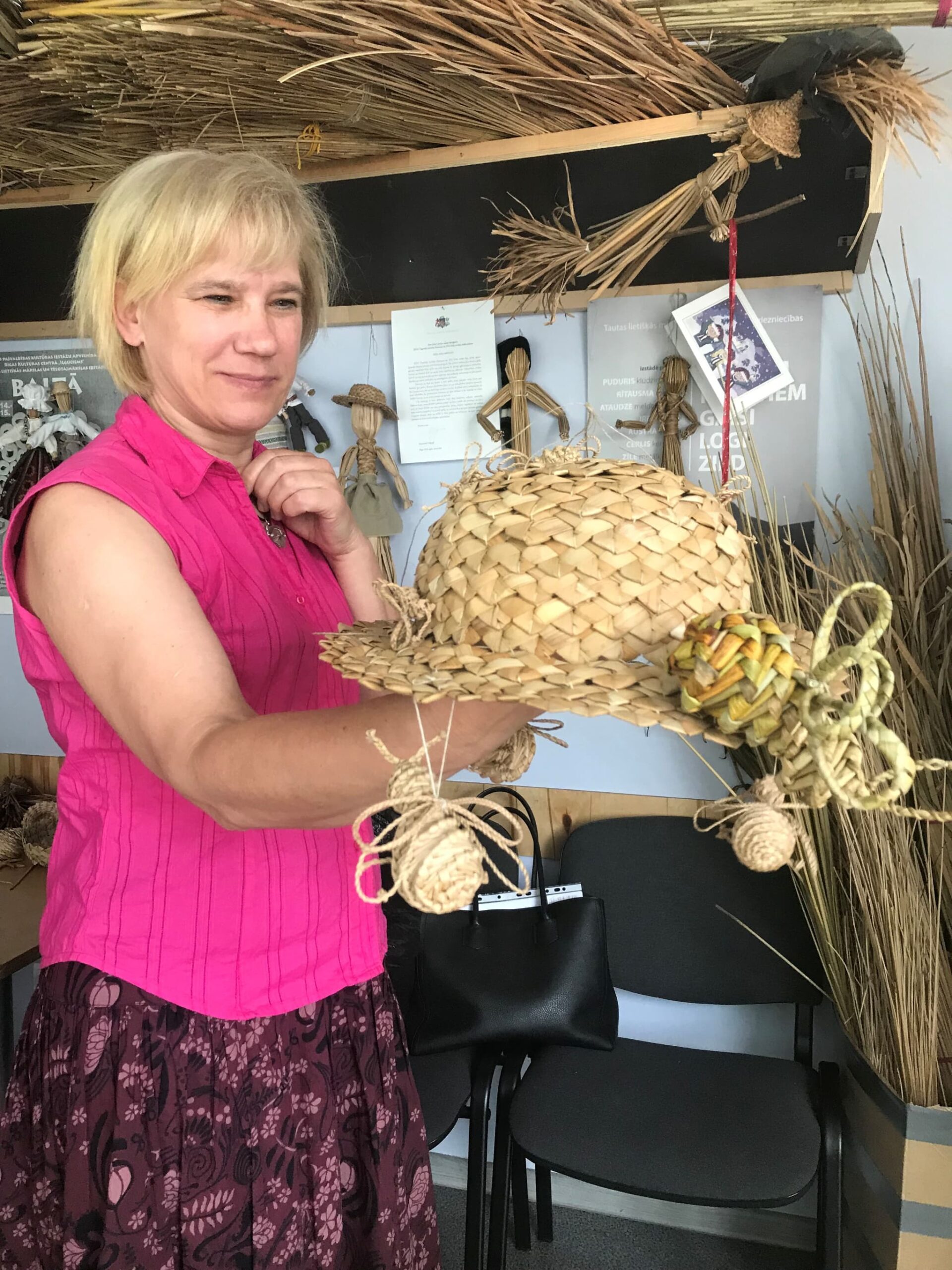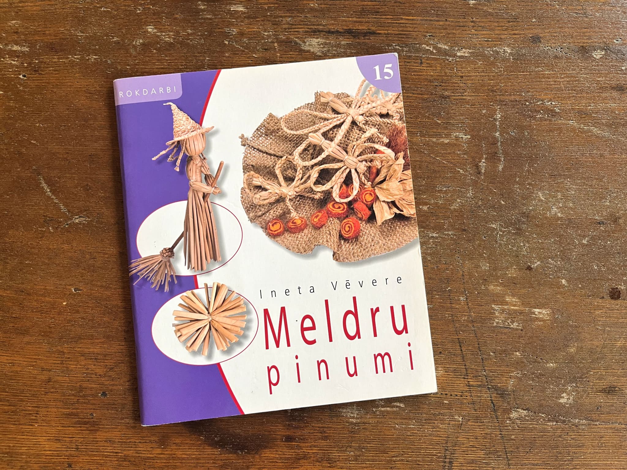ある年、ラトビア野外民族博物館の民芸市に出店していたイネタ先生たちのもとに、シーマニスという名前の老人がやって来て、「メルドゥリ」で編む方法を教えてあげよう、と話しかけてきたそうです。さっそくほかのメンバーたちと一緒に、シーマニスさんのもとで「メルドゥリ」を用いた歯型の編み方を学び、それを縫い合わせて帽子を作りました。「メルドゥリ」で編むことをとても気に入ったイネタ先生は、それを素材にさまざまなアイテムを作り始めたのだそう。子どもが生まれたときには、自然素材の玩具で遊んでほしいと考え、いろいろなおもちゃも作り始めたそうです。お子さんたちは、歯の生える時期になると「メルドゥリ」で編まれた人形をかじるのをたいそう気に入ったのだとか!