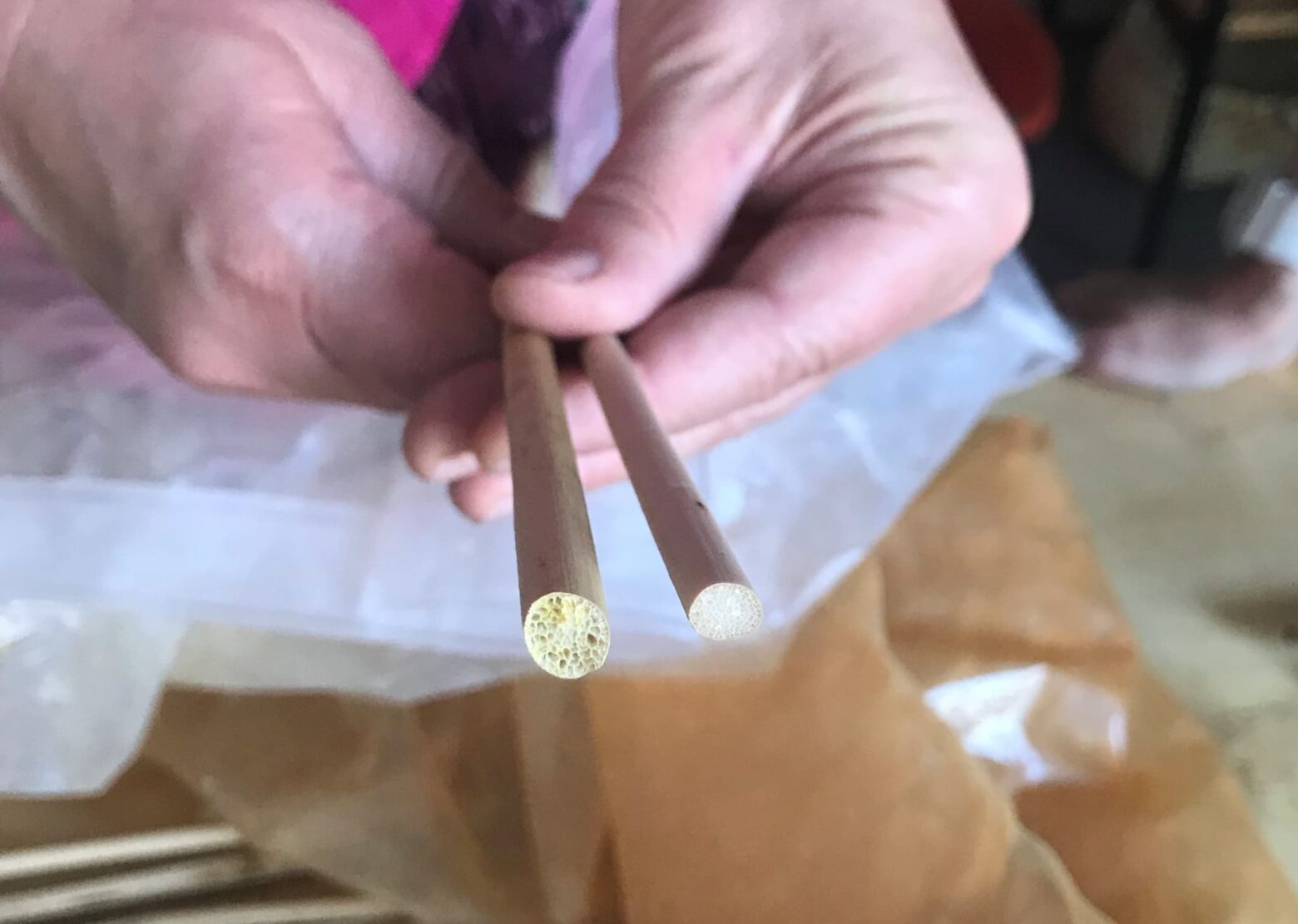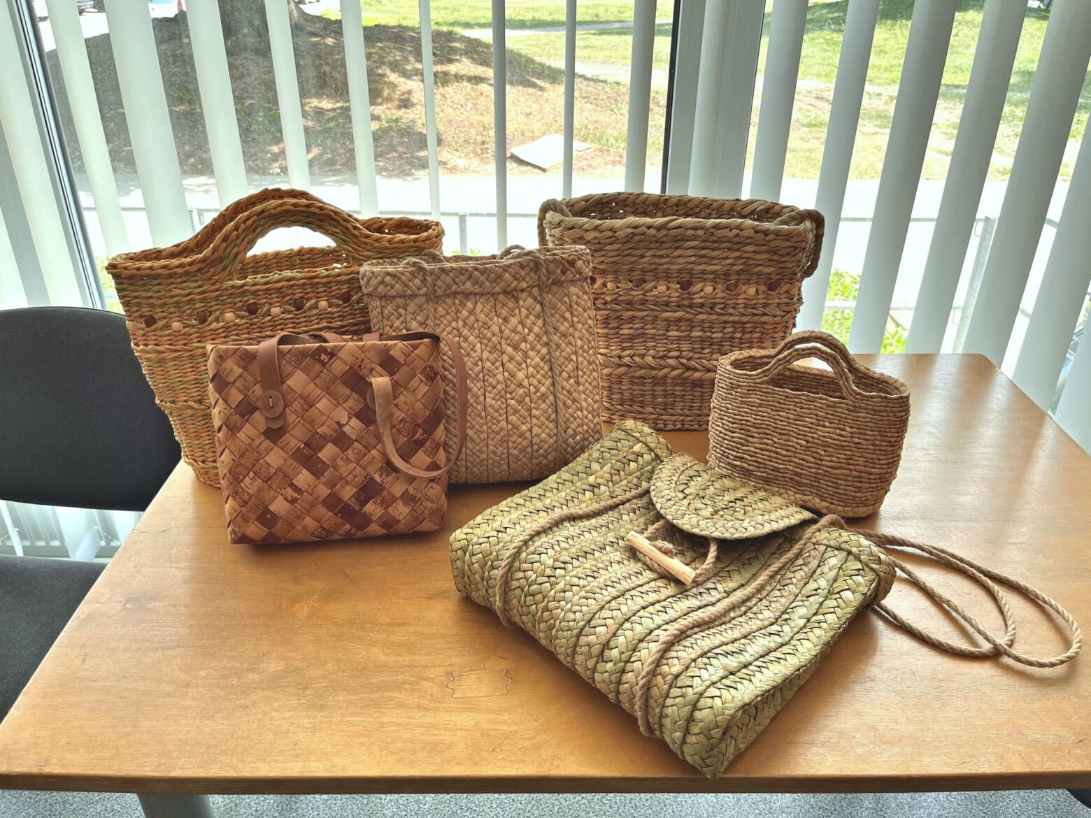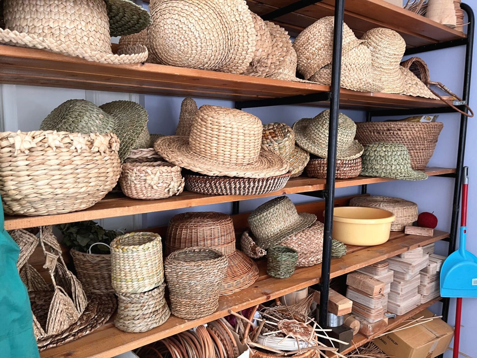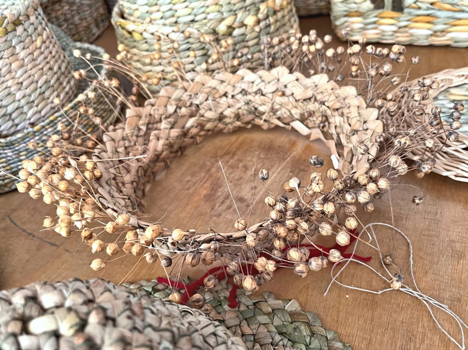 様々な経験を積んでいるイネタ先生は、どんな材料でも編むことができますが、とくにこだわって使っているのが海辺でとれる「メルドゥリ」。夏にしか収穫できず、収穫作業は重労働だそうですが、太陽、風、水、鳥の鳴き声、小石や貝殻を感じながら、海のそばで過ごすのはとても気持ちがいいそうです。