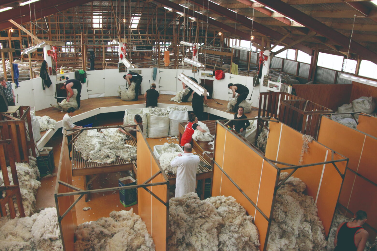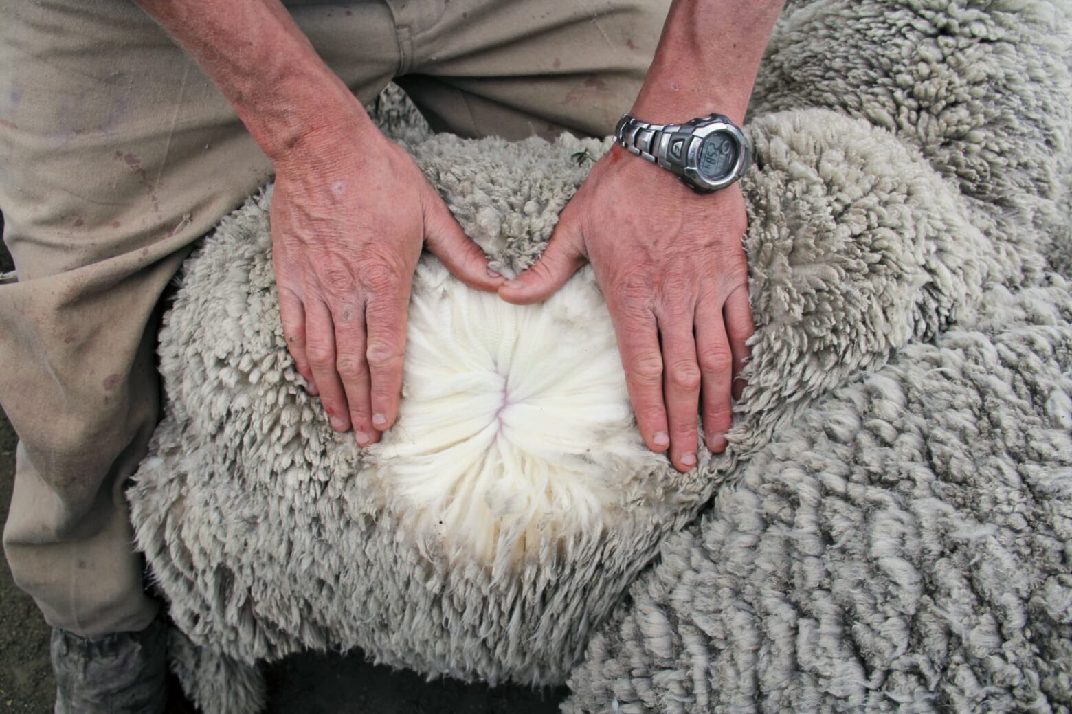 羊の毛は年に一度、春~初夏の間に刈り取ります(毛刈り)。1頭の刈り取りに要する時間は25分ほどで、毛を刈り取る「シアラー」、刈り取った毛のかたまりを折りたたむ「ウールローラー」、サポートのシェットハンドと呼ばれる人たちが、一つのチームを組んで牧場をまわるそうです。