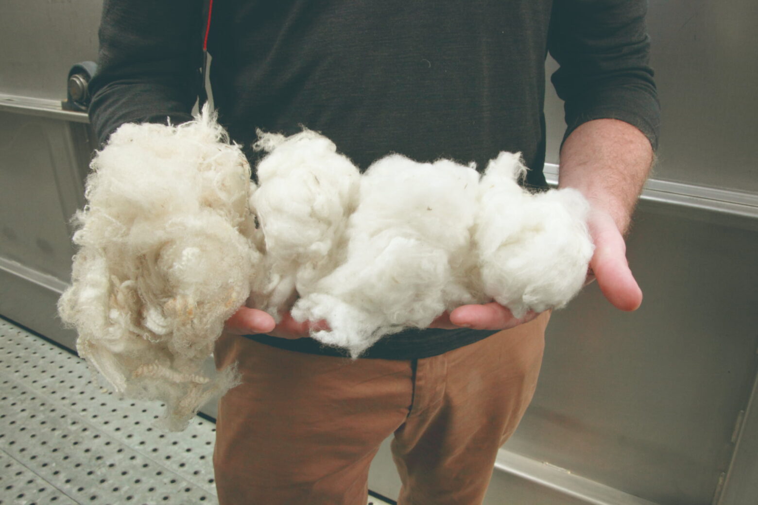 洗いが完了し、適度な水分を残して乾燥させた状態の羊毛のことを、「スカードウール(洗い上げ羊毛)」と呼びます。この工場で行う作業はここまで。スカードウールは次の工程のために、マレーシアの工場へ移動します!
