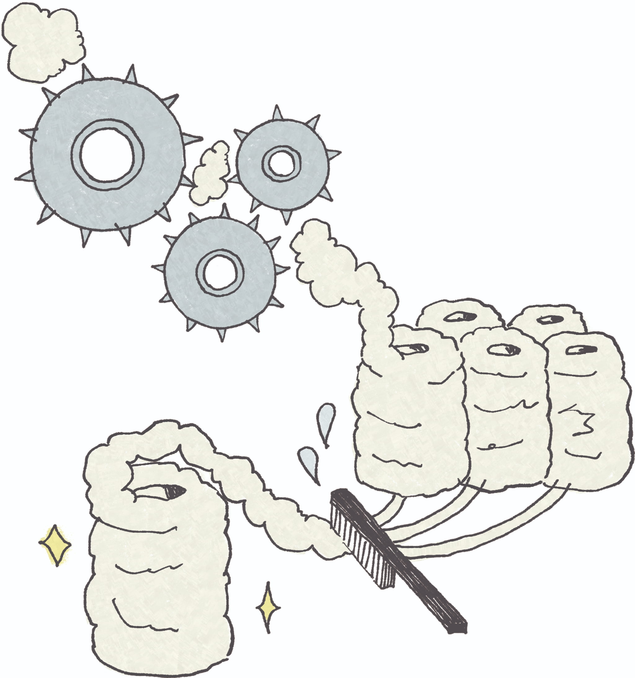 工場に到着したスカードウールは、最初に「カーディング」という工程に進みます。カーディングとは、ざっくりいうと羊毛をほぐす作業のこと。スカードウールを針のある大きなローラーに通してセットし、機械でローラーを回転させながら羊毛の繊維をほぐして薄い毛の膜をロープ状に束ねていきます。